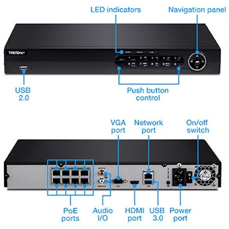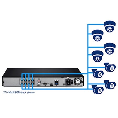 اتصال به ۸ دوربین PoE یه صورت همزمان | ضبط با کیفیت 1080 پیکسل به صورت همزمان بروی تمام کانال ها | پشتیانی از ۲ هارد ، مجموعآ بیش از ۱۲ ترابایت